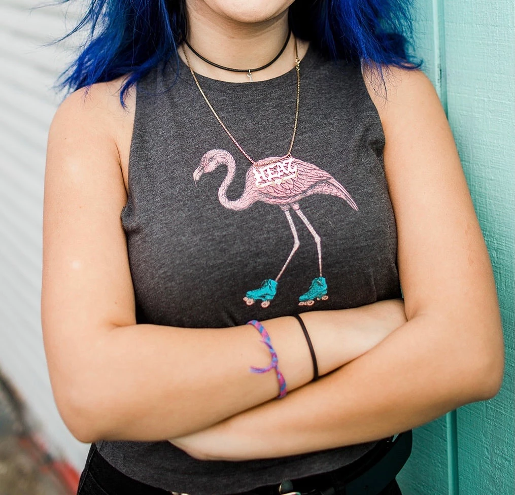Exclusive “Phoebe the Flamingo” racerback crop. Super soft and flowy, great for cruising around on your new skates!