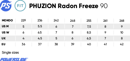 The Powerslide Phuzion Radon Freeze 90 is a fitness inline skate that combines urban style with unmatched comfort. Constructed by using only the best materials, combining a soft upper that adapts to your style with the stable platform of the TRINITY X mounting system, to deliver a new level of performance. The new upper design includes TPU welded reinforcements to give you the comfort and support that you need. Adding high level components like Powerslide´s Elite casted aluminum, updated Powerslide Infinity wheels and fast rolling Wicked bearings to enjoy skating everyday. The Radon is made for those looking for a comfortable fitness skate with no compromises on style or performance. In the mood for Phuzion.