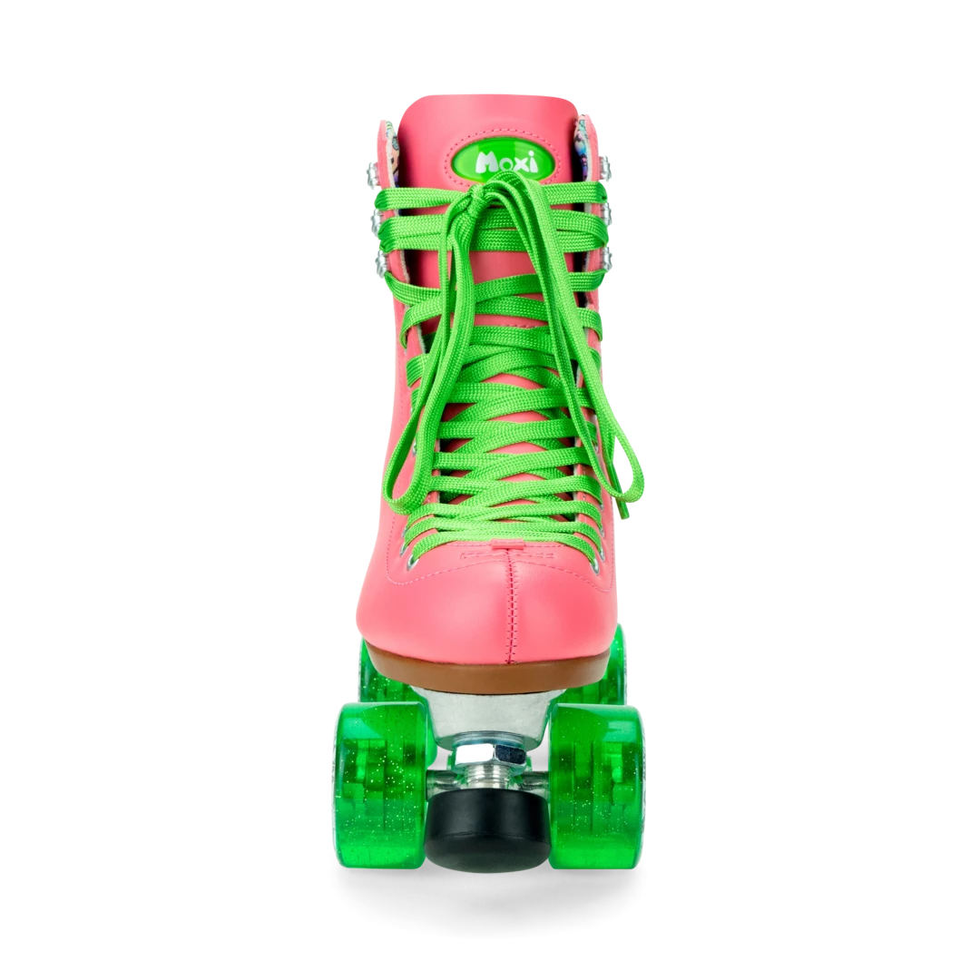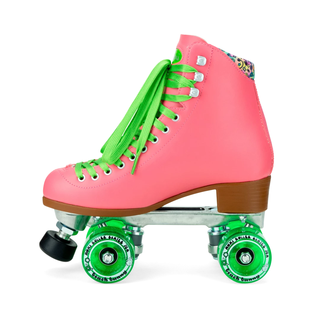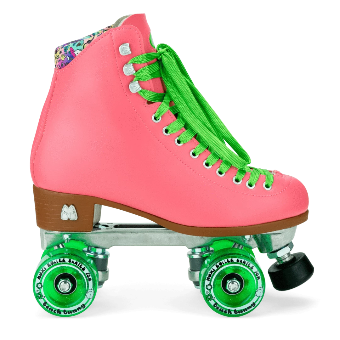 With the Beach Bunny line, classic Moxi fashion has never been more affordable! The Beach Bunny features a traditional high top boot with thoughtful touches including drum-dyed vinyl uppers for more authentic color saturation and additional ankle padding that provides comfort and security whether you’re cruising down the boulevard or ripping up your favorite skate park. Bright laces that shine in the sun add to the fashion-forward design of the Beach Bunny, and the moisture-wicking Dri-Lex™ liner is printed with a custom pattern that was designed from scratch by Moxi team members for a skate that is 100% Moxi, inside and out. Complete with glittery high rebound urethane outdoor wheels and a pair of matching toe caps, the Beach Bunny is ready to accompany you on your next adventure!