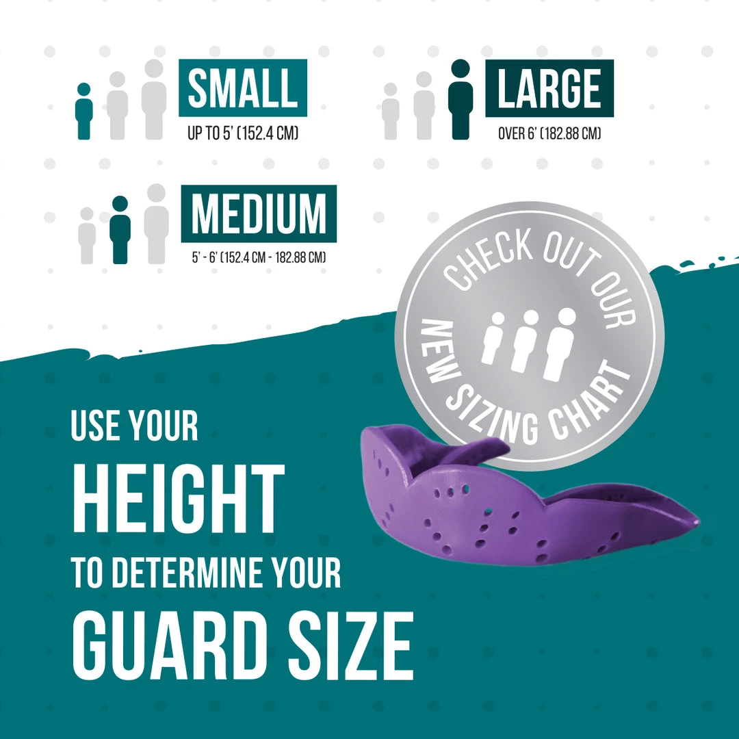 Research suggests the taller you are, the larger your dental arch. And Thus, a bigger mouthguard is required as height increases. Our new and improved sizing system uses the findings of extensive research and testing to suggest the proper guard for you base on how you measure up.
